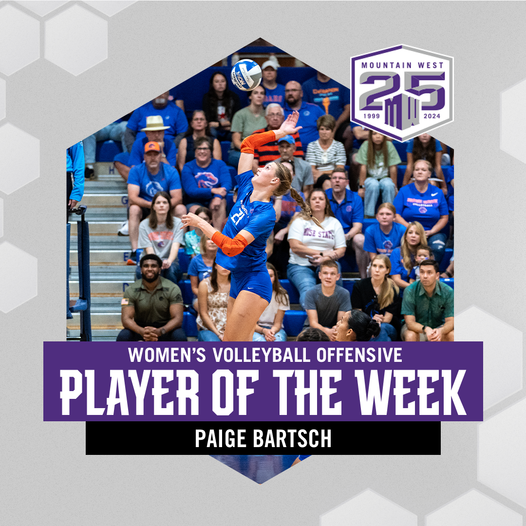 COLORADO SPRINGS, Colo. – Boise State junior Paige Bartsch has been tabbed the Mountain West Volleyball Offensive Player of the Week. New Mexico’s Angela Crosetti garners Defensive Player of the Week honors, while Nevada’s Tehya Maeva is named the Freshman of the week.