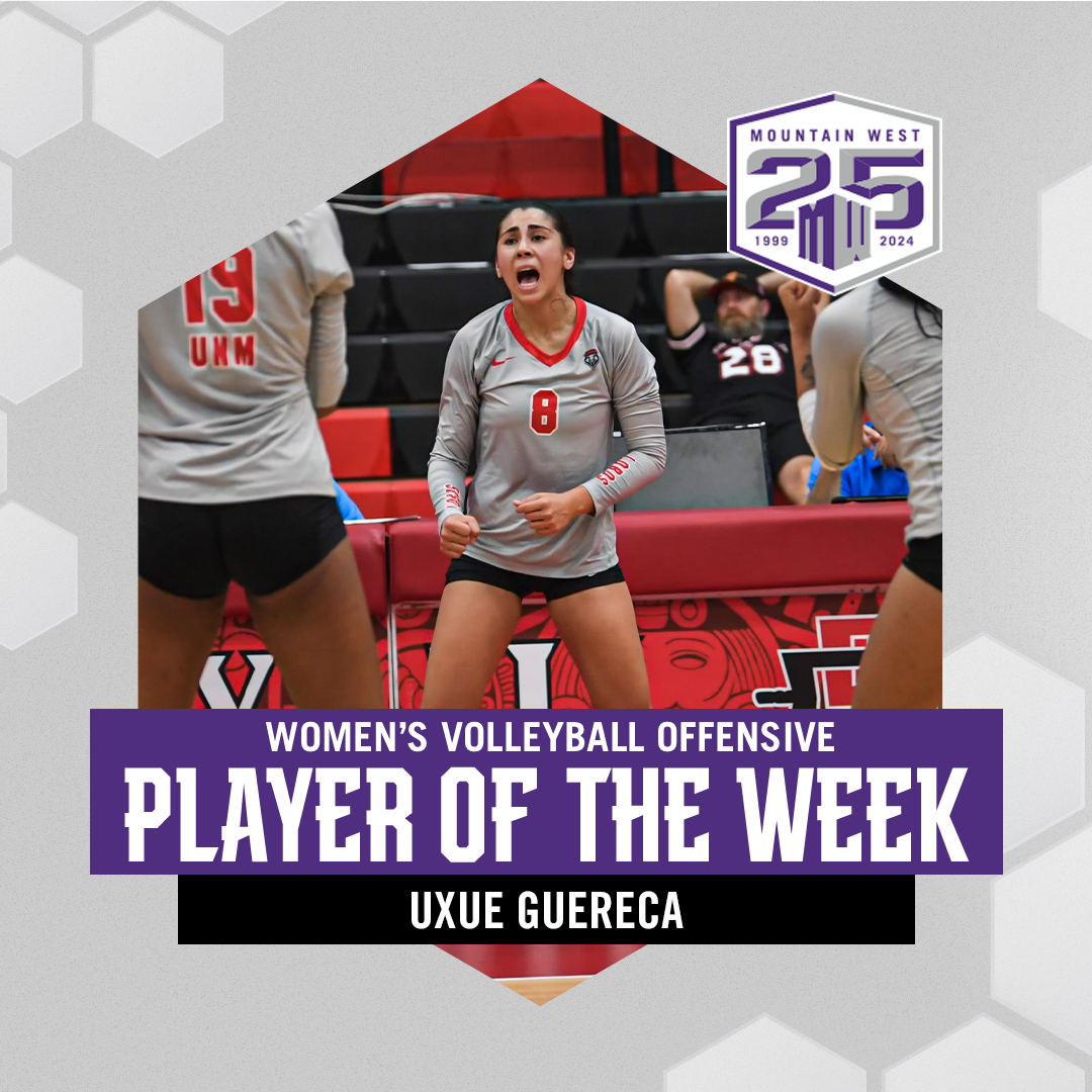 COLORADO SPRINGS, Colo. – New Mexico’s Uxue Guereca has been tabbed the Mountain West Offensive Player of the Week. Boise State sophomore Bella McGirr is named the MW Defensive Player of the Week and MW Volleyball Freshman of the Week honors go to Wyoming’s Sierra Grizzle.