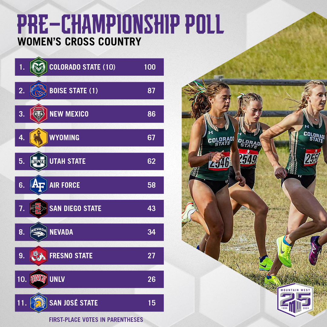 Rounding out the MW women’s pre-championship poll is New Mexico in third (86 points), Wyoming in fourth (67 points), Utah State in fifth (62 points), Air Force in sixth (58 points), San Diego State in seventh (43 points), Nevada in eighth (34 points), Fresno State in ninth (27 points), UNLV in 10th (26 points) and San José State in 11th (15 points).