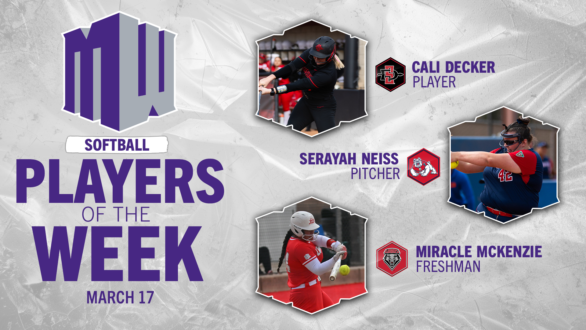COLORADO SPRINGS, Colo. – San Diego State’s Cali Decker was named the Mountain West Softball Player of the Week while, Fresno State’s Serayah Neiss was selected as the MW Pitcher of the Week. New Mexico’s Miracle McKenzie picked up the MW Freshman of the Week nod.