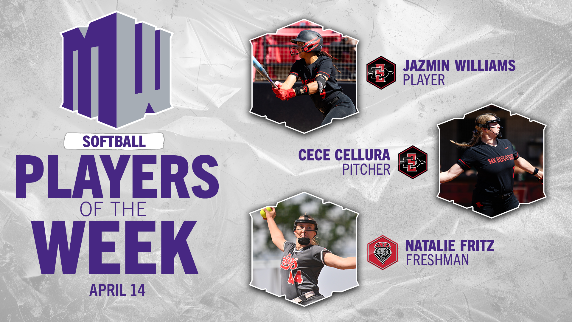 COLORADO SPRINGS, Colo. – San Diego State’s Jazmin Williams was named the Mountain West Softball Player of the Week, while teammate Cece Cellura was tabbed MW Pitcher of the Week. New Mexico’s Natalie Fritz picked up the MW Freshman of the Week nod.