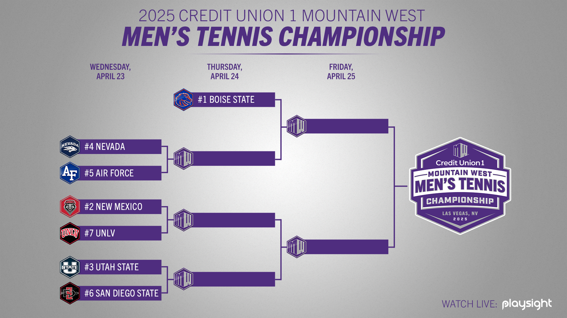 Live stream coverage will be available throughout the 2025 Mountain West Championship on PlaySight with commentary for the championship match on Friday, April 25. Live scoring can be found on iOnCourt.