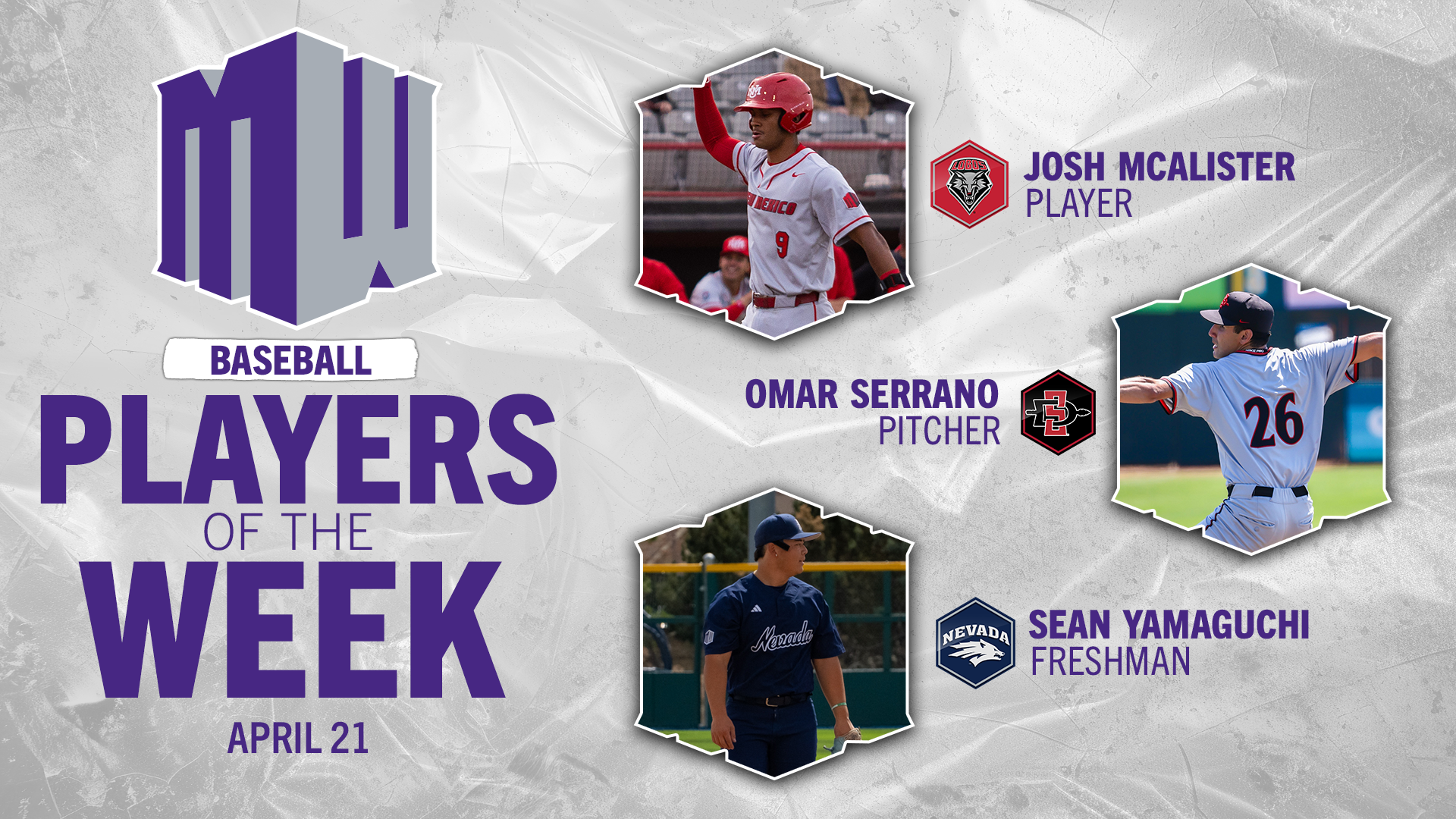 COLORADO SPRINGS, Colo. – New Mexico senior Josh McAlister has been named the Mountain West Baseball Player of the Week, while San Diego State senior Omar Serrano has been selected the MW Baseball Pitcher of the Week. Nevada rookie Sean Yamaguchi has been selected as the MW Baseball Freshman of the Week.