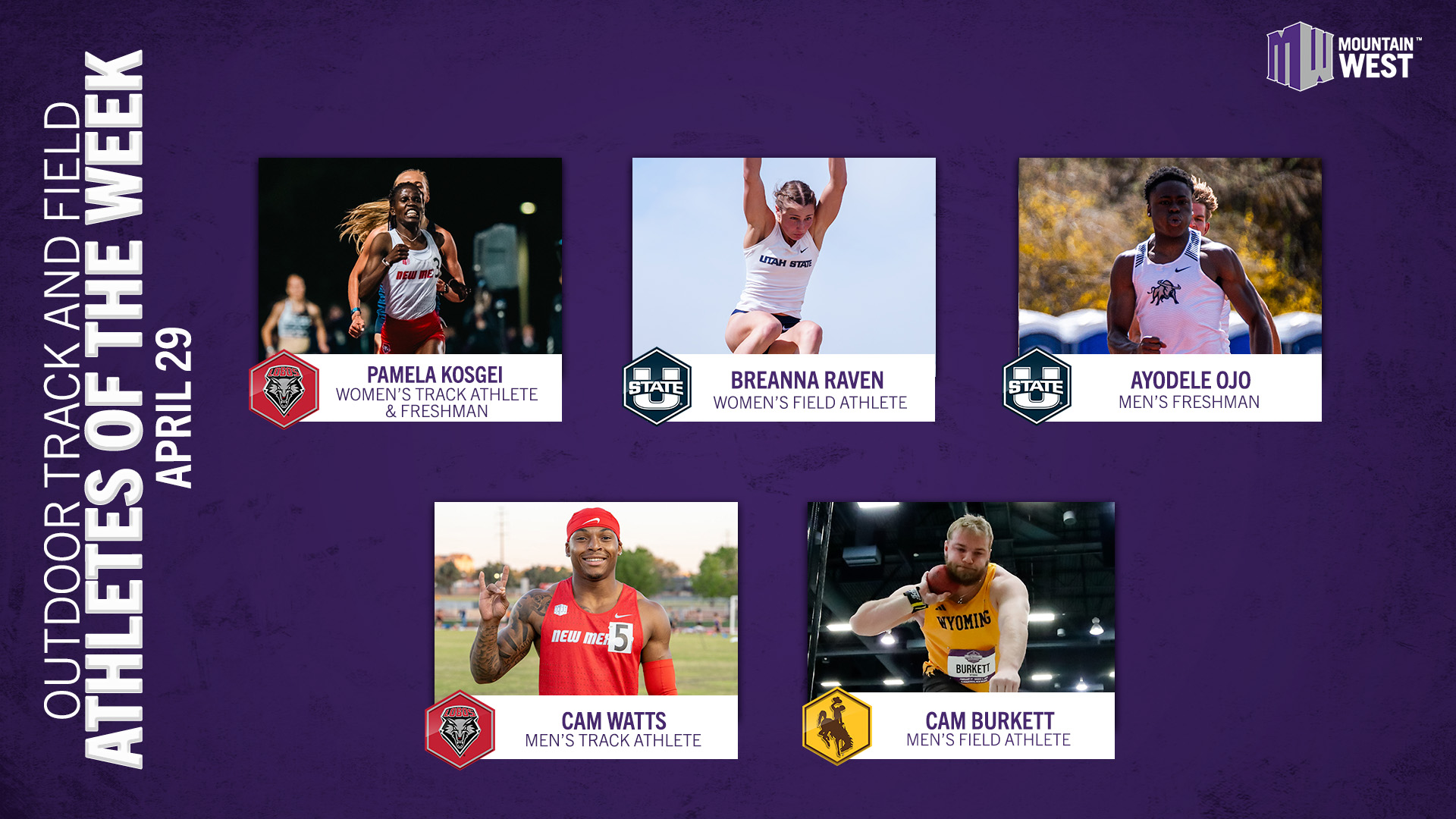 On the men’s side, New Mexico’s Cam Watts garnered the MW Men’s Track Athlete of the Week award for the second time in the last three weeks, Wyoming’s Cam Burkett picked up the MW Men’s Field Athlete of the Week honor and Utah State’s Ayodele Ojo was named the MW Men’s Freshman of the Week.