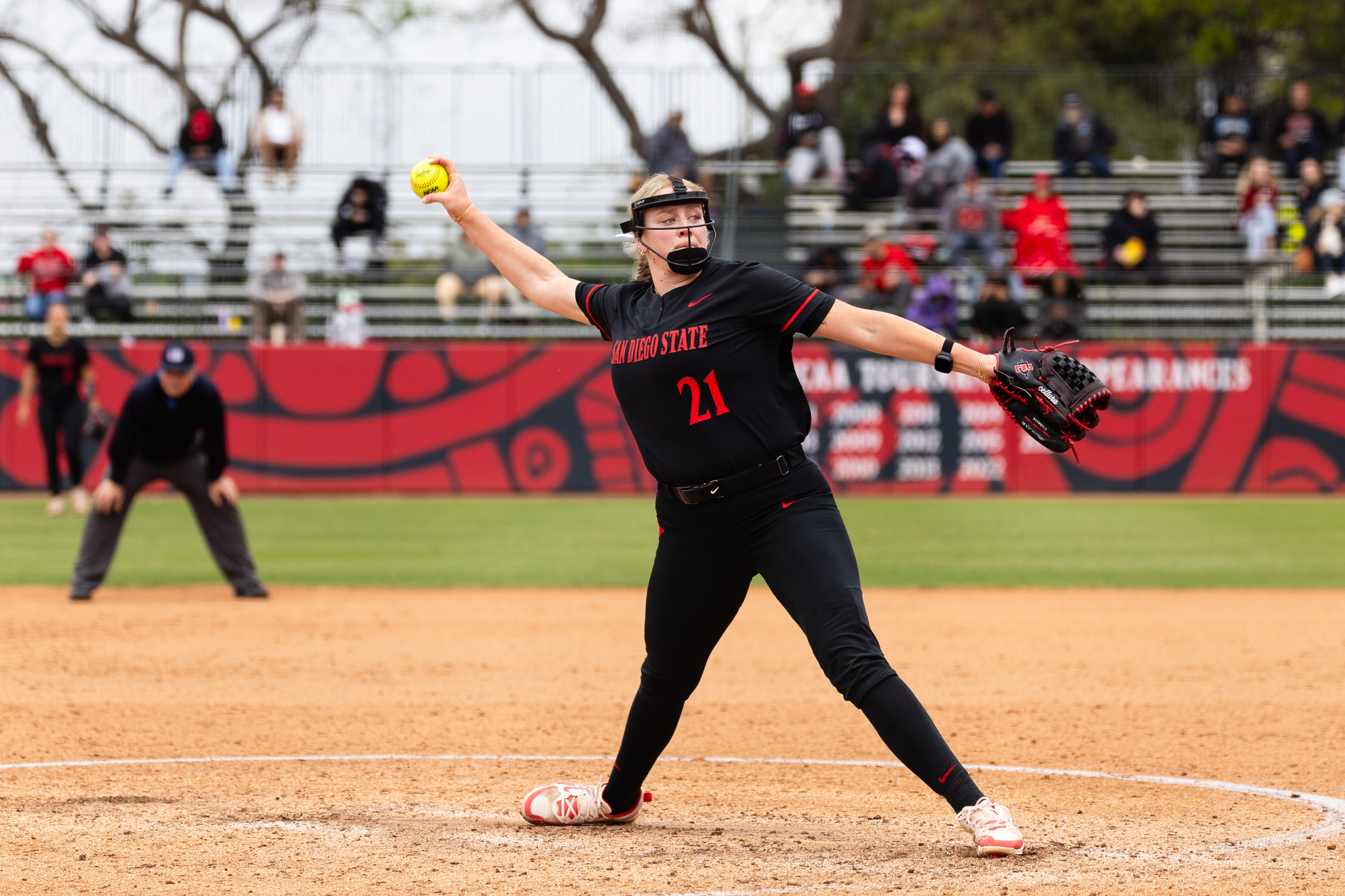 Mountain West Player of the Year Aaliyah Jenkins doubled to left center to lead off the seventh and bring the tying run to the plate. Cellura got Di Genova to fly out to left and Jenkins moved to third. She scored on a single to left center off the bat of Engelbrecht. The winning run stepped to the plate in the form of Painter, and she doubled down the right field line. The tying run, Engelbrecht, was held up at third with just one out. Cellura fell behind in the count 3-1 to Saskia Raab but got a foul ball for strike two before striking her out looking for the second out. Larsen stepped up to the plate and fouled off Cellura’s first three offerings. On the fourth pitch, Cellura got Larsen to chase an outside fastball to strand the runners, end the game and send the Aztecs on to the championship.