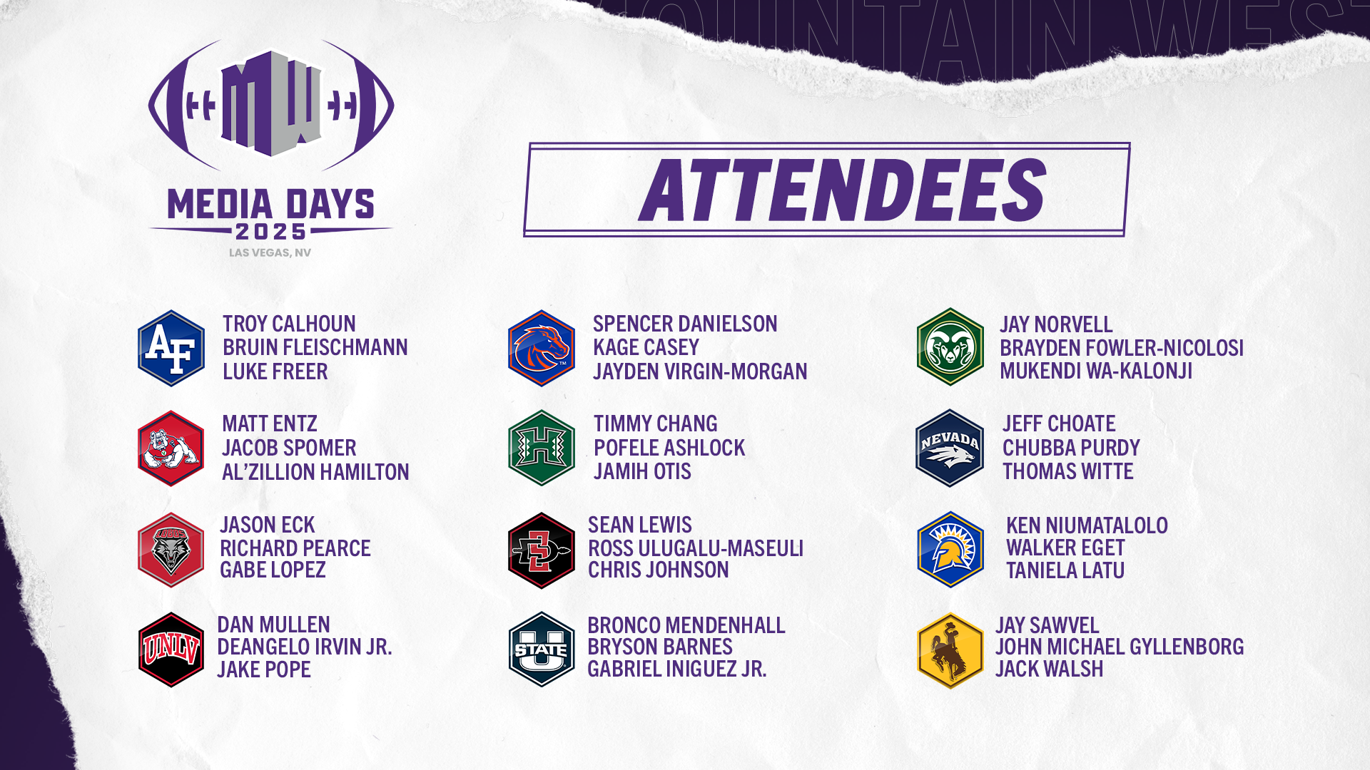 COLORADO SPRINGS, Colo. – The Mountain West announced today the school representatives for the 2025 MW Football Media Days. Each program will be represented by two student-athletes on Wednesday, July 16, and its head coach on Thursday, July 17. MW Football Media Days will be held at Circa Resort & Casino Las Vegas for the third straight year.