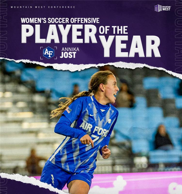 Air Force sophomore Annika Jost has been named the Mountain West Offensive Player of the Year, while Boise State goalkeeper Ava de Leest was tabbed as the MW Defensive Player and Newcomer of the Year. Air Force head coach Laura Busby was voted as the MW Coach of the Year.