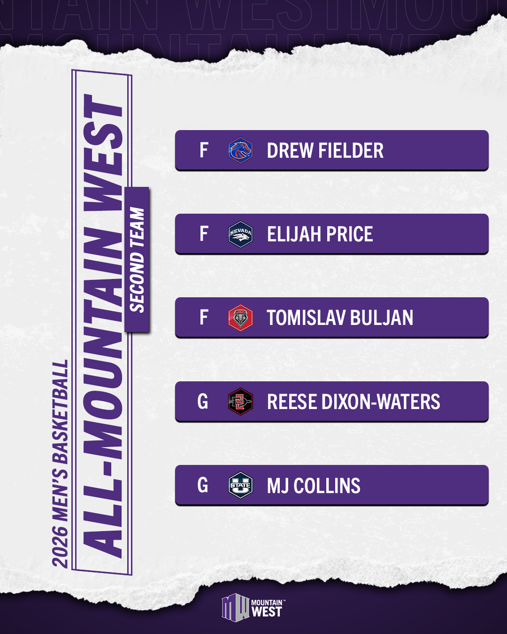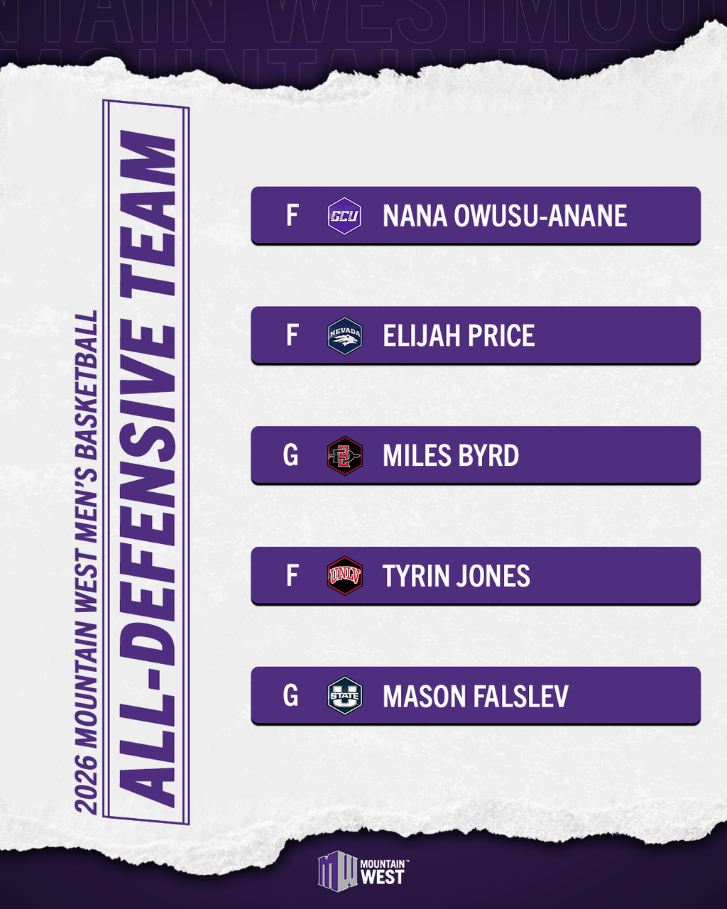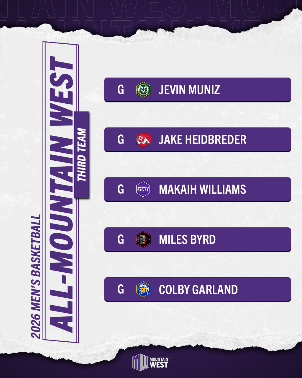 Utah State head coach Jerrod Calhoun was named the MW Steve Fisher Coach of the Year, while Aggie junior guard Mason Falslev was selected as the MW Player of the Year. San Diego State’s Miles Byrd was voted as the Defensive Player of the Year. UNLV junior guard Dra Gibbs-Lawhorn was voted the MW Newcomer of the Year, while Utah State junior forward Karson Templin was recognized as MW Sixth Man of the Year. New Mexico newcomer Jake Hall was honored as the MW Freshman of the Year.